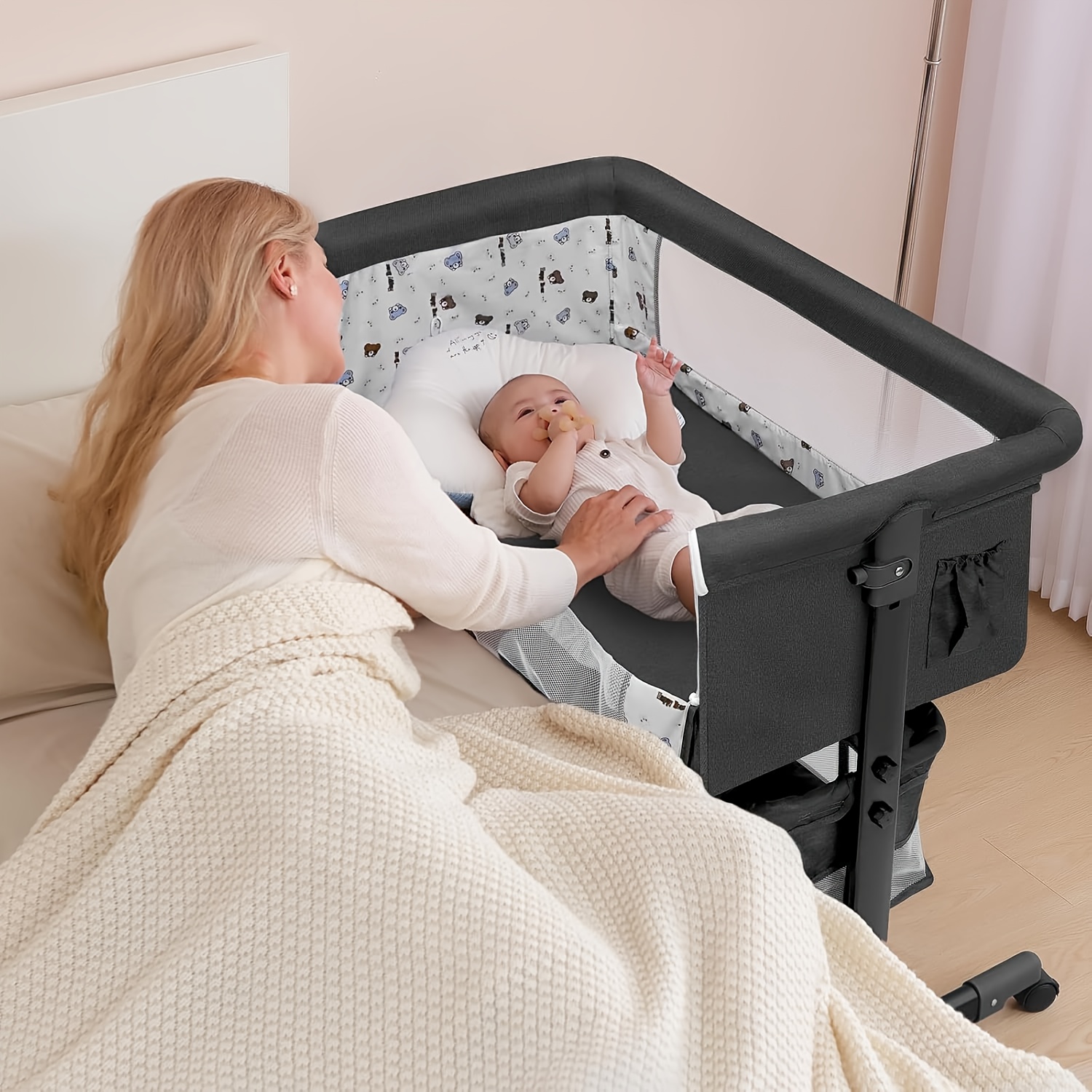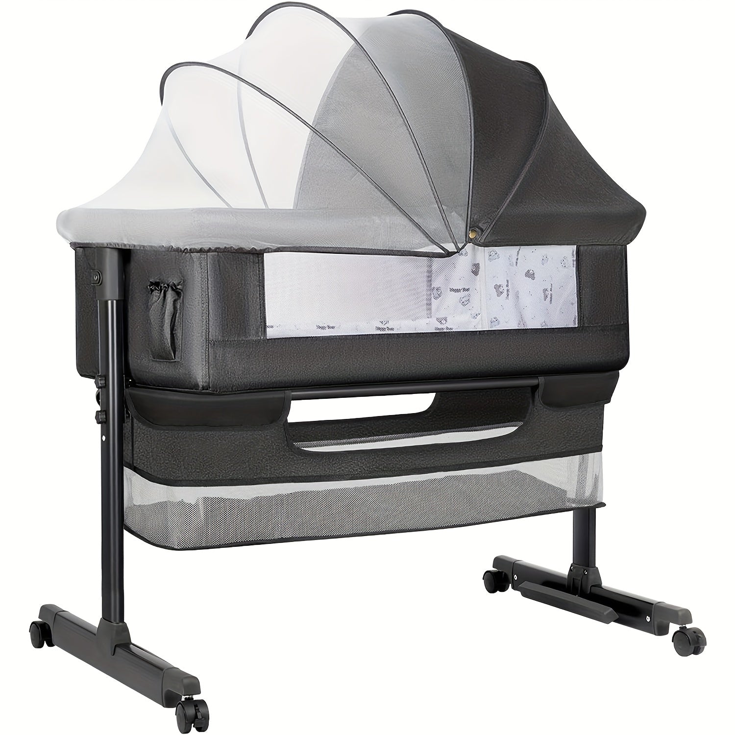 Baby Bassinet Bedside Sleeper with Rocking Motion, Lockable Wheel & Storage Basket - Adjustable Height, Fence & -Compatible Frame - Easy Assembly Metal Cot for, Portable Crib (Grey/Black)