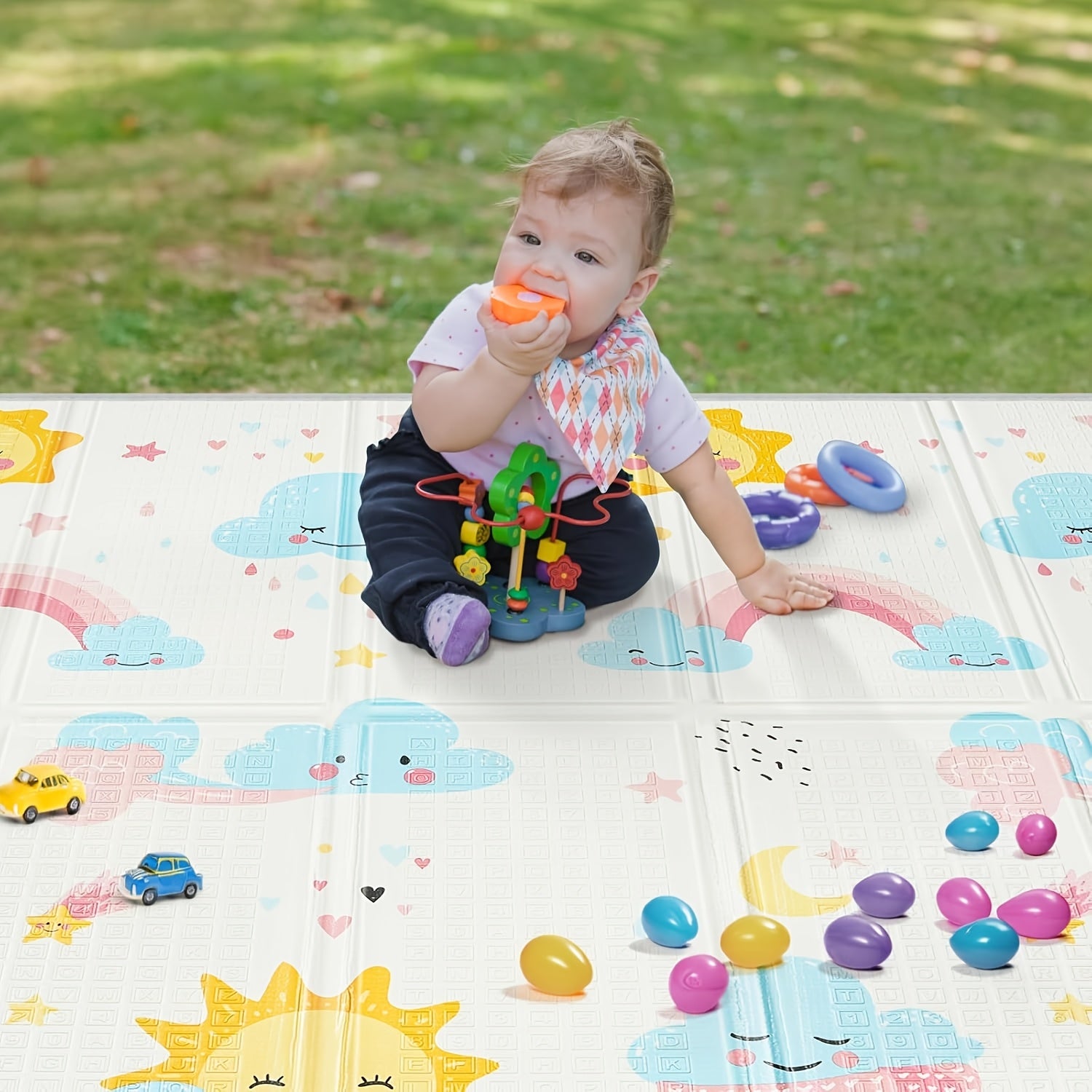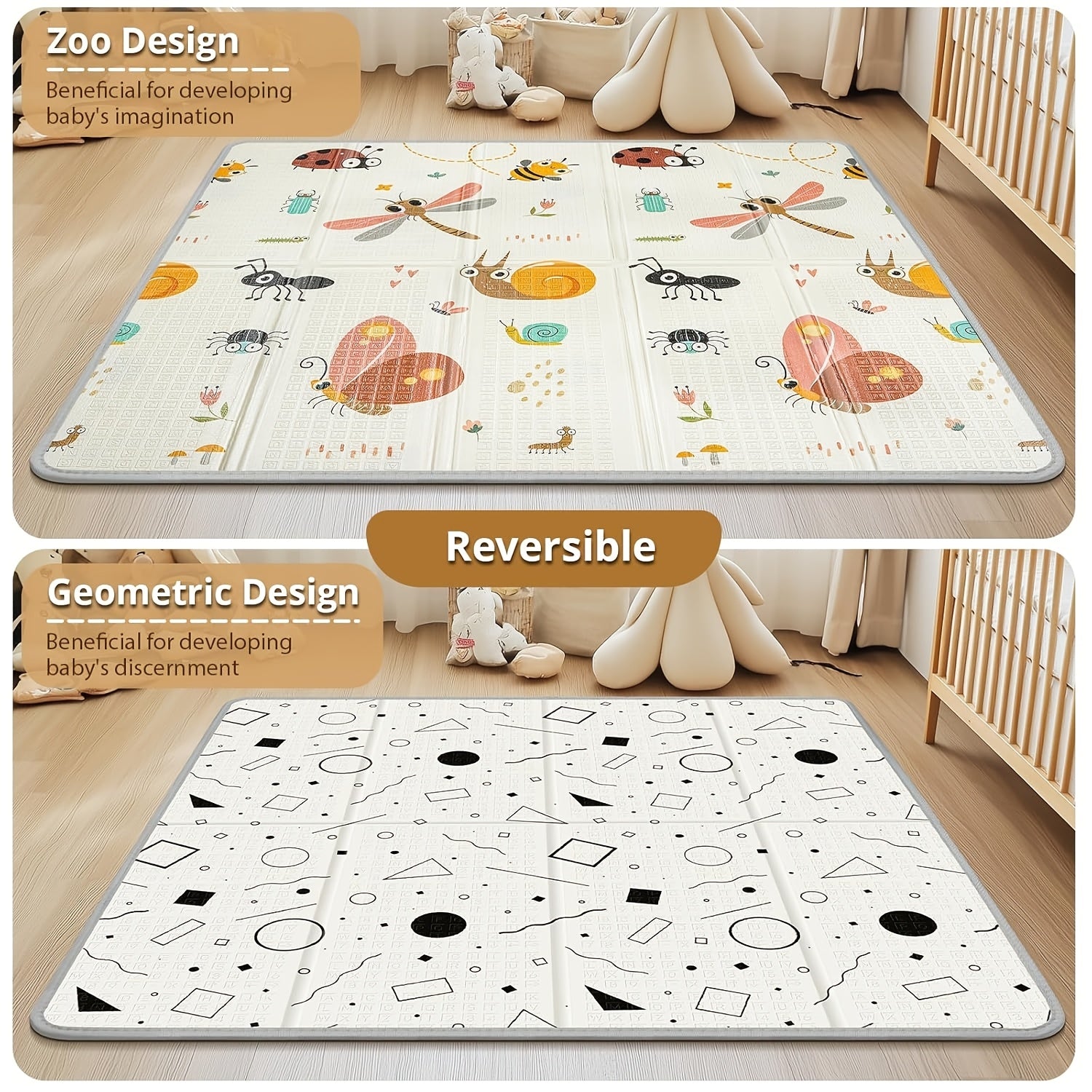 Double-sided design: The foam play mat features two sides, each with a unique pattern. One side showcases vibrant shapes to keep babies engaged, while the other side has a minimalist design that complements most home decor styles. Foldable and portable: This baby foam play mat is designed to be foldable, making it easy to carry and store. It comes with a tote bag that allows the floor mat to be quickly folded into a compact size and stored in the bag for convenient outdoor use.