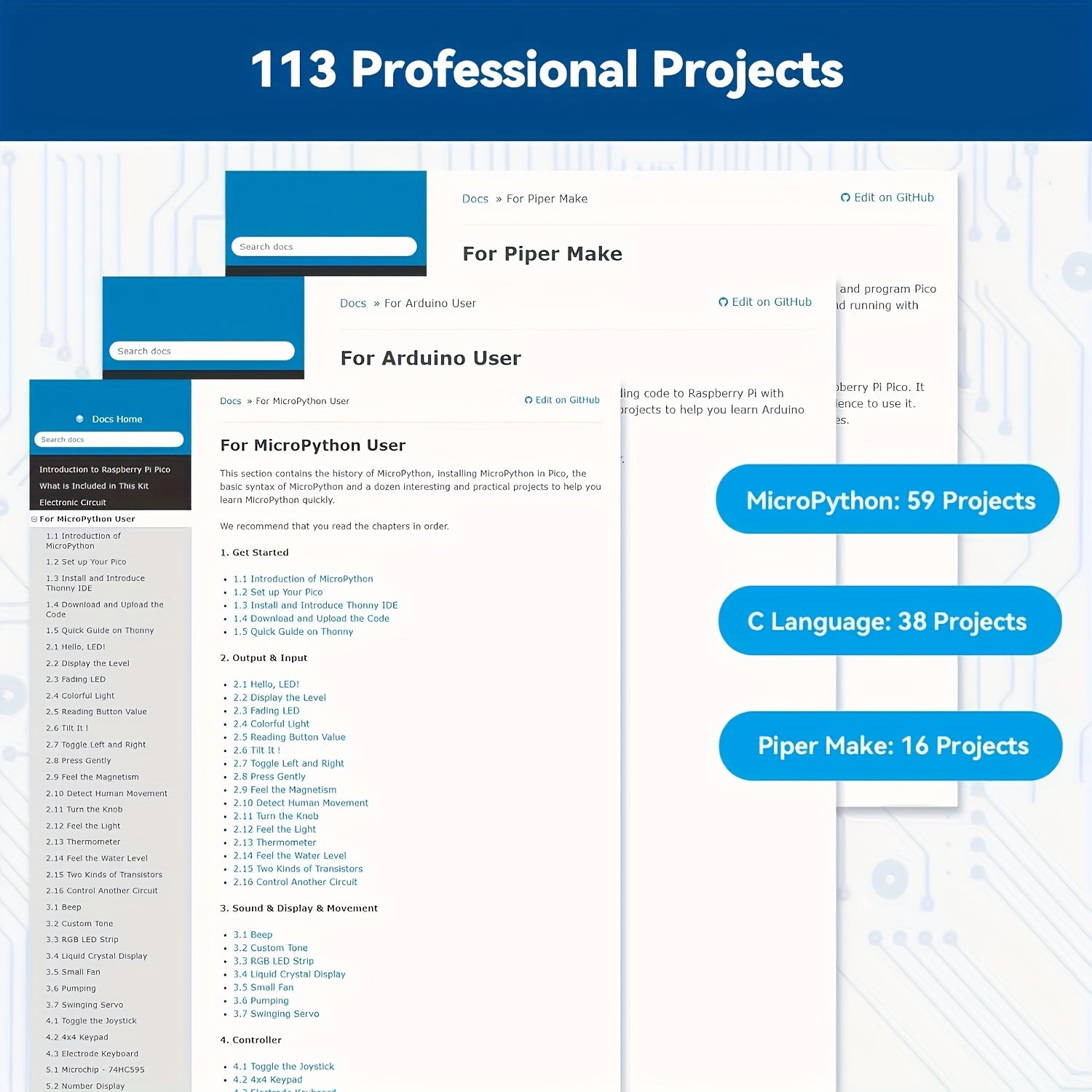 The Ultimate Starter Kit for Raspberry Pi Pico includes three programming languages designed for programmers of all skill levels: 59 lessons in MicroPython, 38 lessons in C/C++, and 16 lessons in Piper Make.