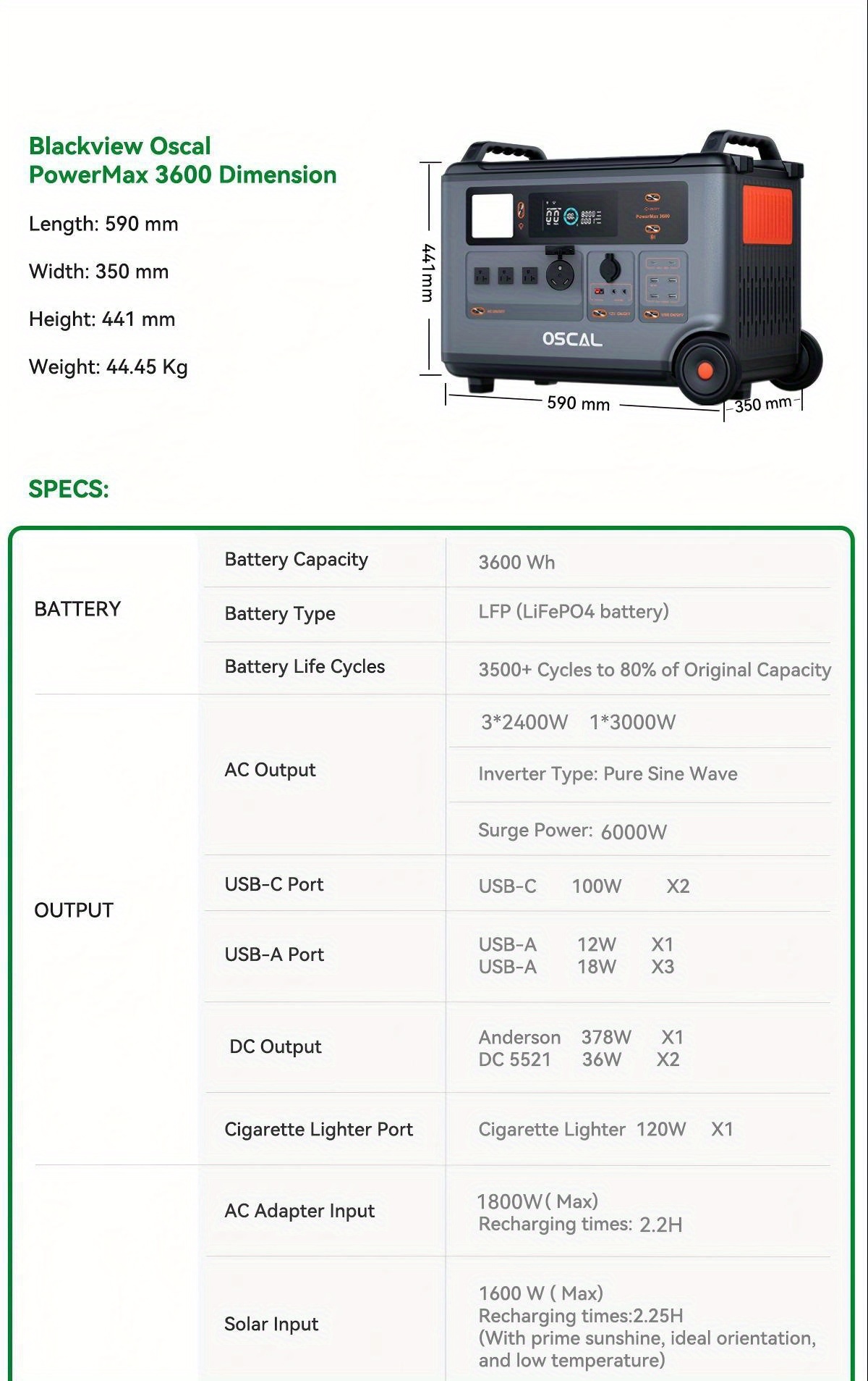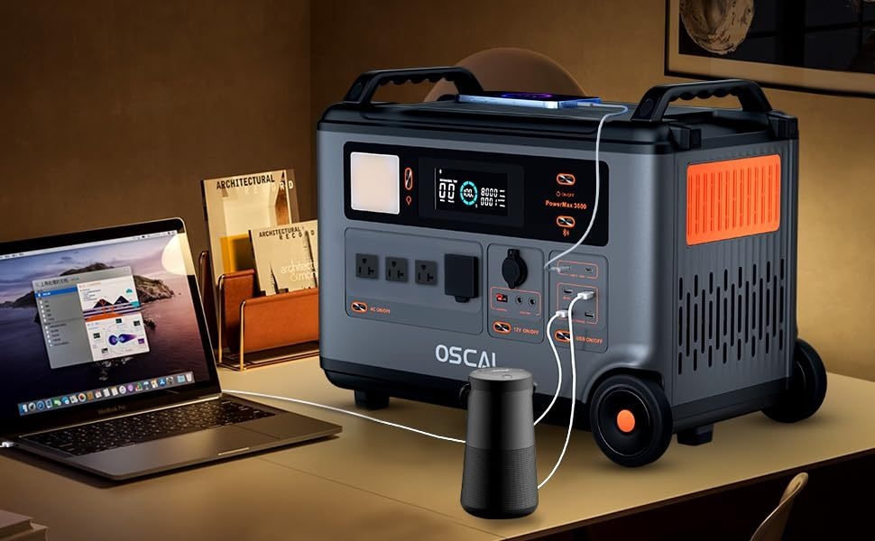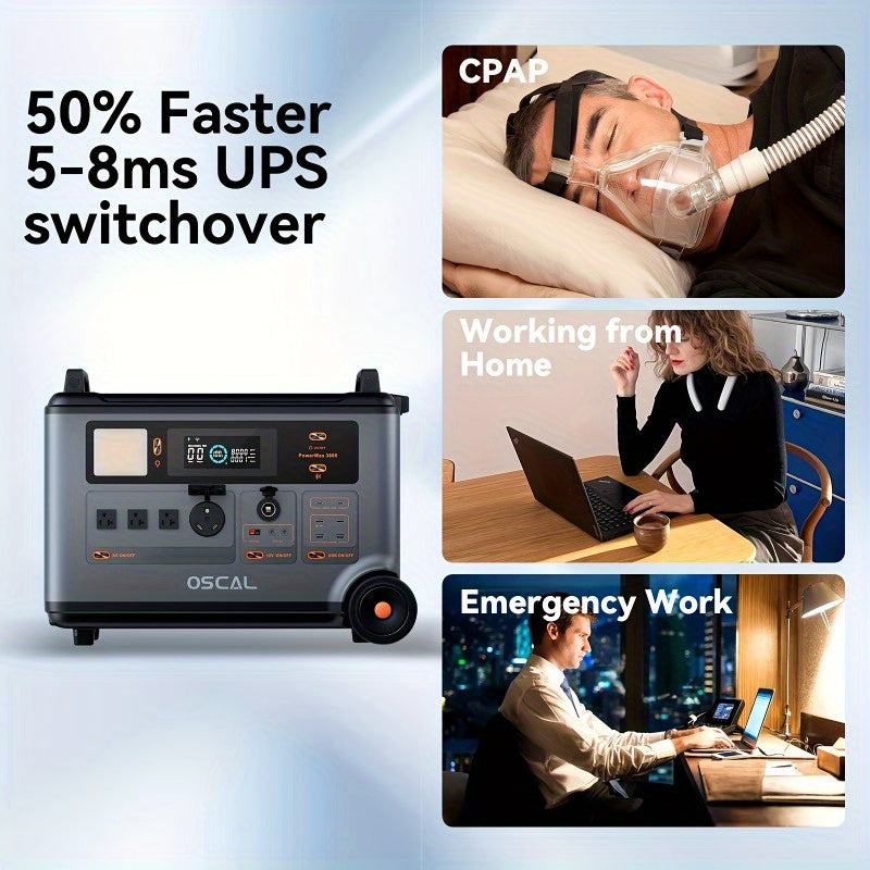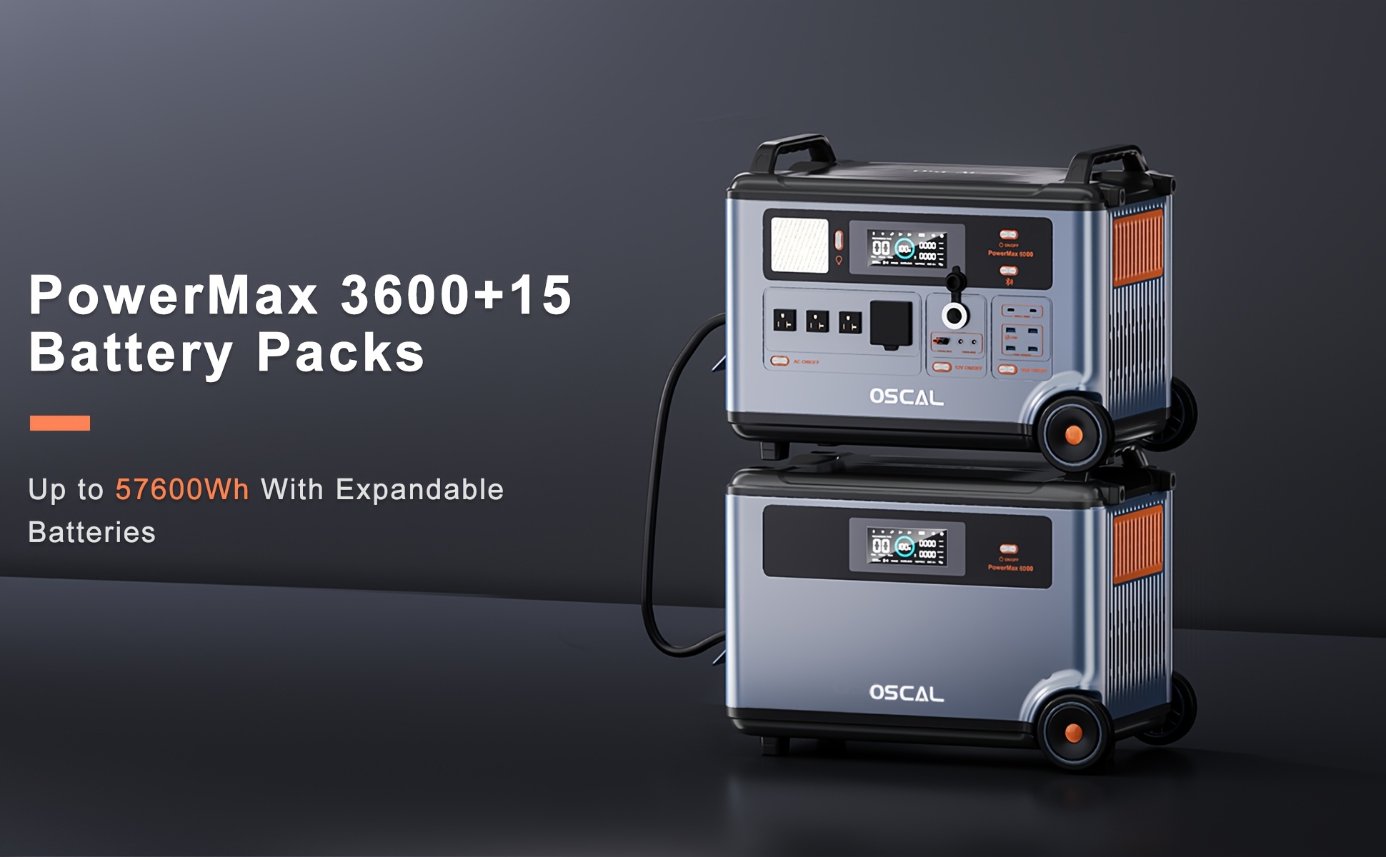 OSCAL PowerMax 3600W 6000W Surge Portable Power Station, 3600Wh LiFePO4 Expandable Solar Generator with 4xAC Outlets, 1.2H Fast Charging, 10ms UPS Backup Power for Home Emergency, Camping, RV, Road Trips - Heavy-Duty Solar-Po