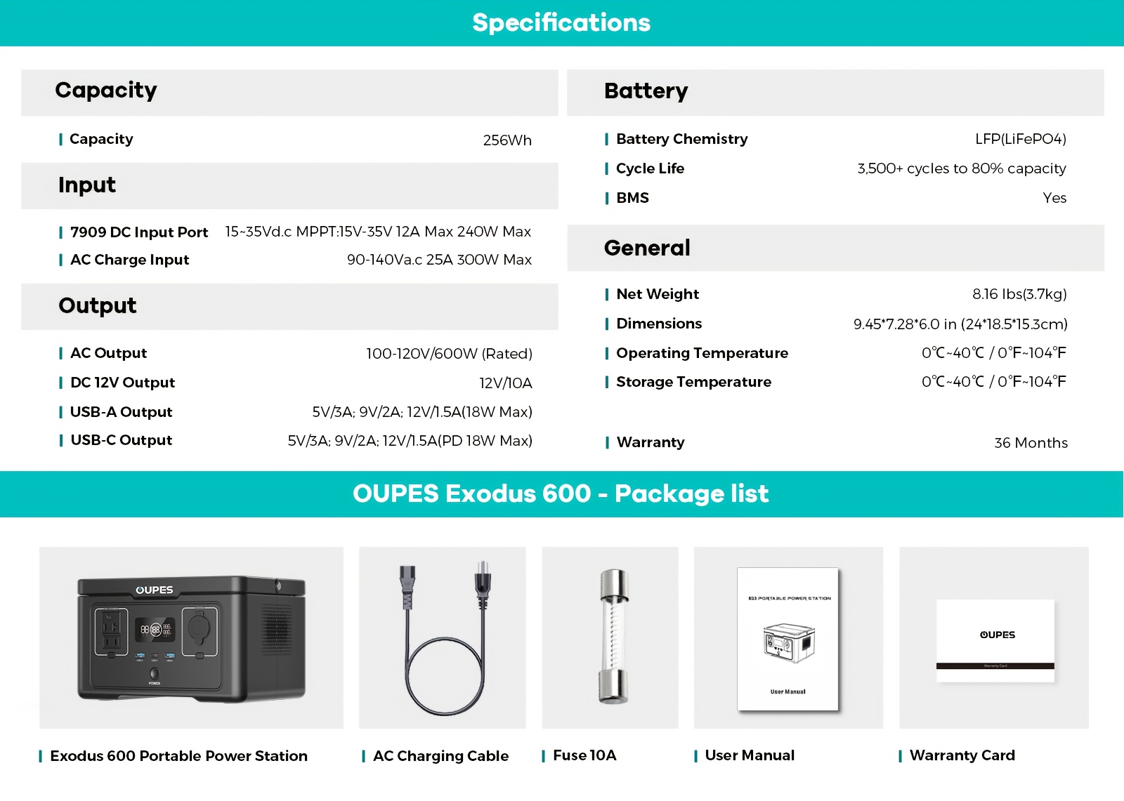 OUPES 600W/256Wh Exodus 600 Portable Power Station(1200W Surge), 256Wh 3.7kg Backup LiFePO4 Battery, 600W AC Outlet, Solar Generator for RV, Outdoors, Camping, Traveling