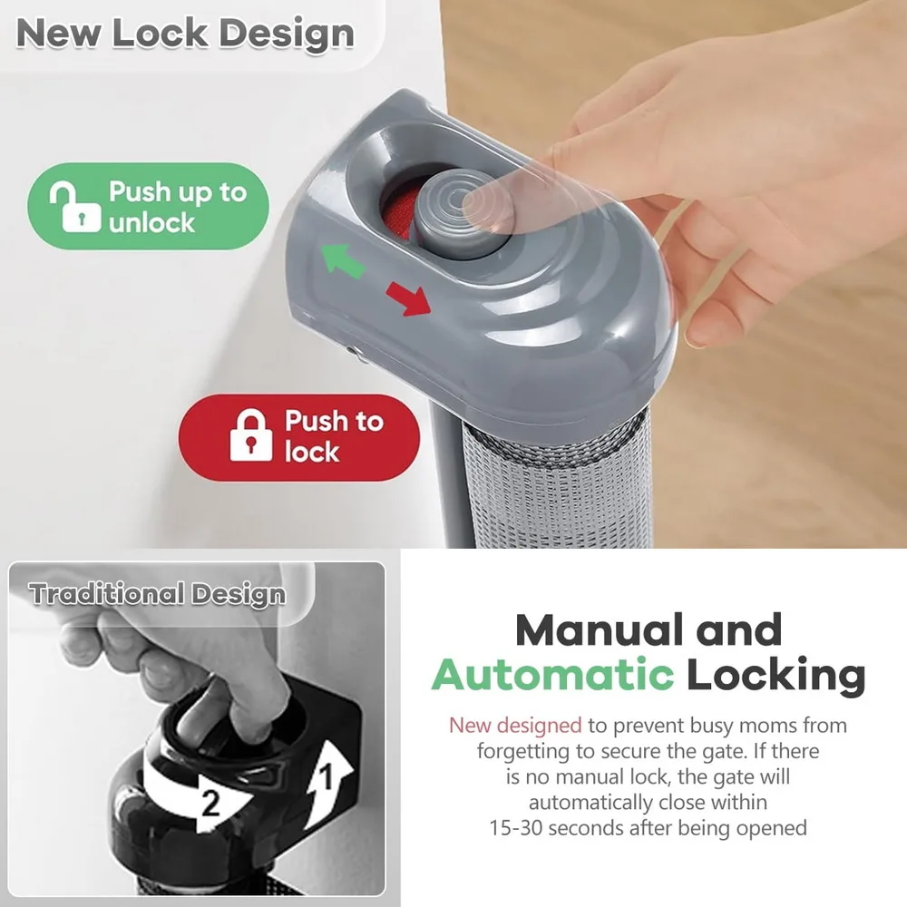 - The simple 2-step operation allows you to open and close while holding your child: 1. Push and release button; 2. Pull the handle to extend the gate, when the handle is released, gate automatically locks the release mechanism.