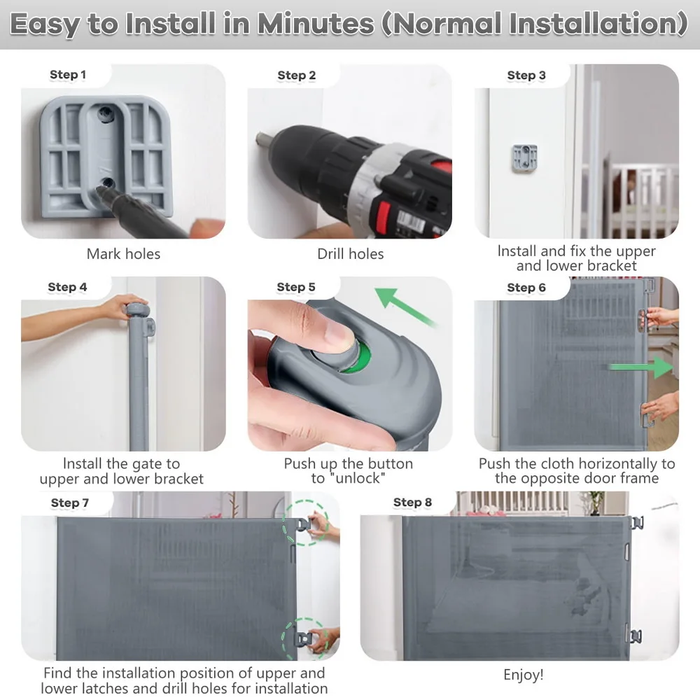 - Each pack contains 1 extra tall gate and the required installation accessories. Retractable baby gates can be widely used for indoor and outdoor areas such as doorways, stairs, hallways.