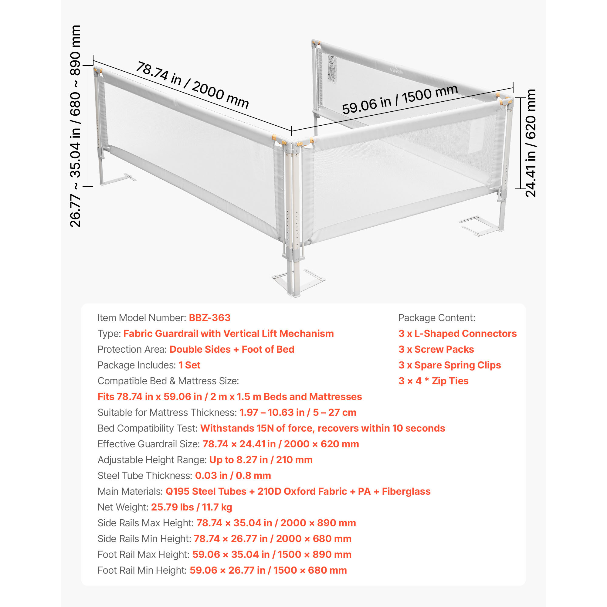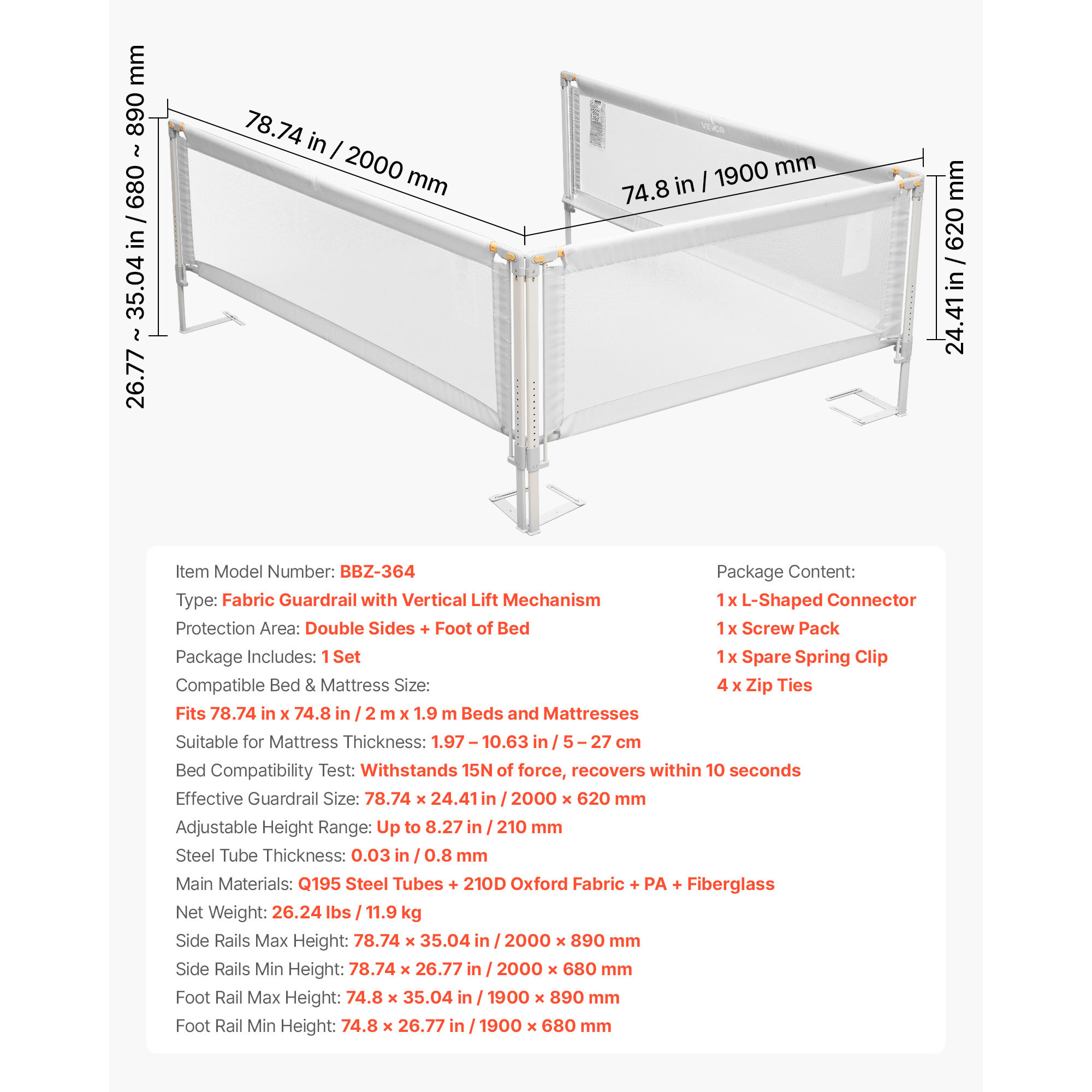 · Fits Most Beds: Height adjusts up to 8.27 in / 210 mm and fits bed side up to 78.74 x 59.06 in / 2.0 x 1.5 m. Compatible with mattress thicknesses from 1.97–10.63 in / 5–27 cm. Works with solid-wood frames, kids’ beds, platform/flat bases, mattresses, and other beds